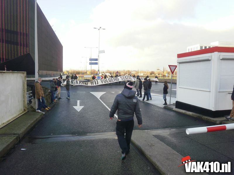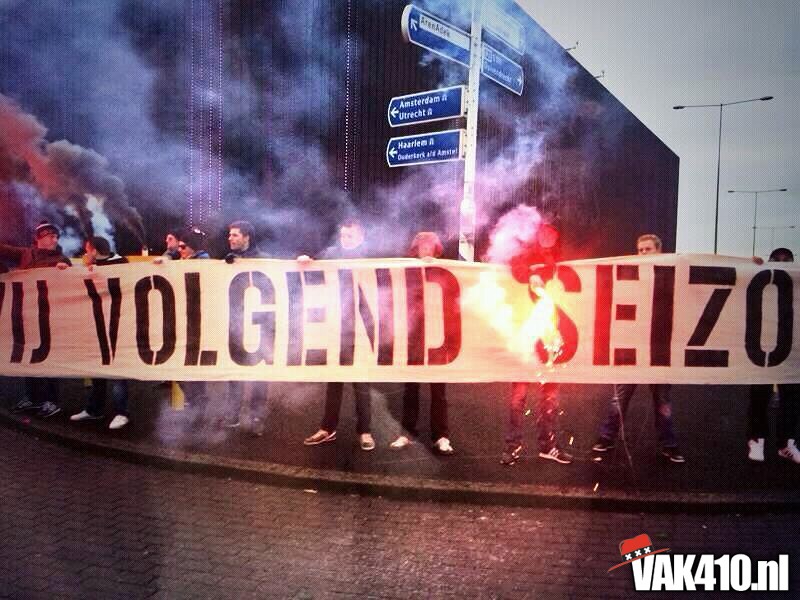 Zondagochtend rond een uur of 10. De spelersbus van Ajax vertrekt naar Den Haag, de aftrap is om half één. Voor het zevende jaar op rij mogen er bij deze wedstrijd geen Ajaxsupporters aanwezig zijn. Bij Noord B is het dan ook leeg. Normaal gesproken waren er op deze ochtend honderden supporters vertrokken voor een combi naar ADO. De termijn van 5 jaar geen onderlinge supporters is voorbij. Wij willen weer naar Den Haag!