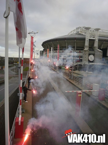 In Amsterdam word er van alles aan gedaan om supporters van Ajax en Den Haag weer de onderlinge wedstrijden te laten bezoeken. Den Haag is dan ook gewoon welkom in de Arena, maar in de hofstad vinden ze het kennelijk allemaal wel prima zo. En daar kunnen wij niet bij met ons hoofd! Uitsupporters voegen aan een wedstrijd beleving toe. Een beetje onderlinge rivaliteit maakt de spanning nog een stuk groter! Wij willen niets liever dan eindelijk weer eens naar Ado te mogen reizen! Vanmorgen werd door VAK410 met een groep van 50 verzameld bij de fly-over van de Arena. Bij het passeren van de spelersbus werd er vuurwerk ontstoken en de spelers werden toegezongen. De enige manier om hen vandaag te supporten. Maar alleen dit jaar nog op deze manier, want voor volgend seizoen zullen wij er voor zorgen dat we hoe dan ook in Den Haag staan! Daarvoor zullen we echt alles uit de kast trekken! Geef ons ADO uit terug! Na het ondersteunen van de spelers werd er koers gezet richting de stad, waar we in de kroeg zagen dat Ajax met liefst 4-0 won.