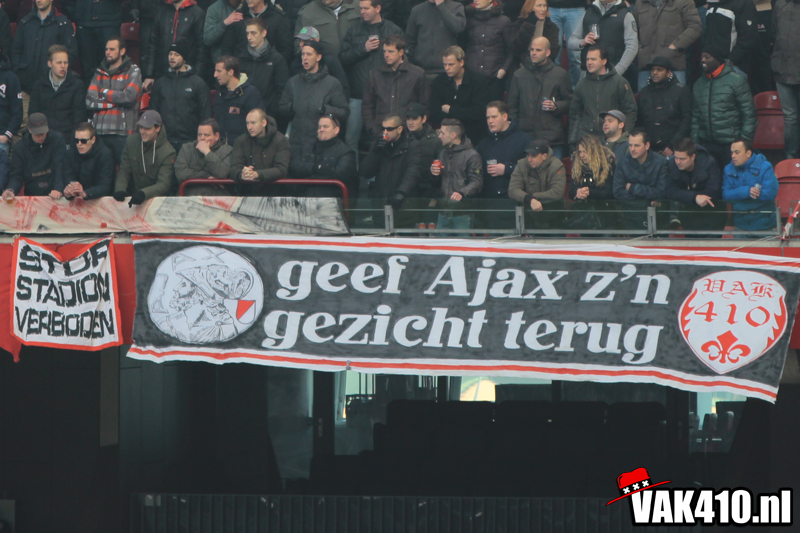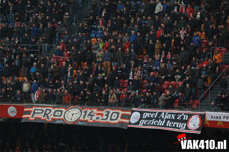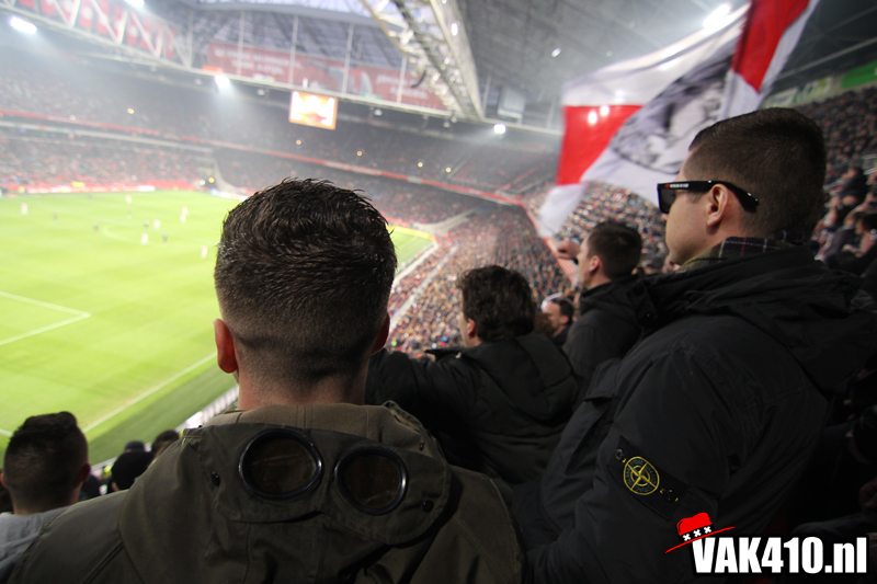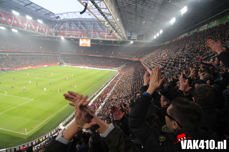 Zodra het metershoge doek naar beneden gaat is het tijd voor chaos. De lijn die is ingezet met AZ thuis kent vandaag zijn vervolg. Opnieuw staan er jongens bij 424 en wordt er 90 minuten lang gevlagd. De sfeer is uitstekend, diverse keren gaat een song goed hard. Ook op het veld gaat het goed. In tegenstelling tot afgelopen weken waar het moeizaam ging en soms met wat gelukt, knokt Ajax zich vandaag terug na een achterstand.