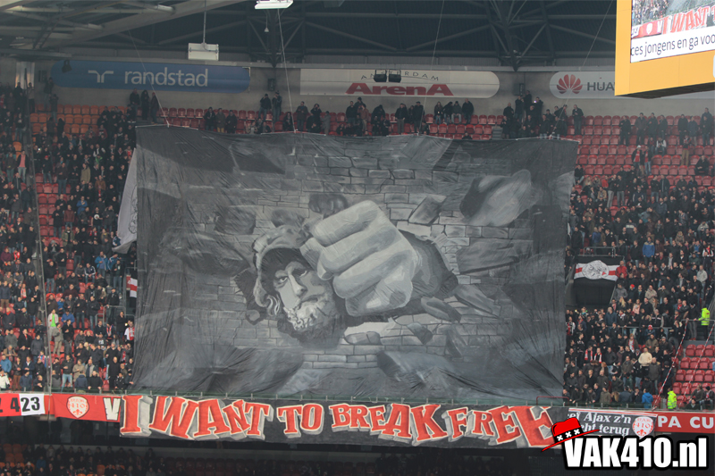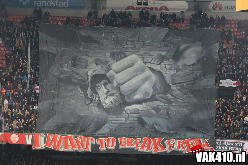 In het kader van de actie 'Geef Ajax z'n gezicht terug' stond er een grote Tifo actie op de planning. Wij zullen net zolang blijven strijden voor het oude logo totdat deze terug is. Hierdoor werd er dan ook wederom door diverse jongens een hoop werk verricht in de weken voor deze wedstrijd. Vandaag is het resultaat daar. Bij opkomst van de spelers wordt er een gigantisch hijsdoek omhoog getrokken met daarop onze Griekse held, die met zijn vuist door een muur heen slaat. De tekst op het balustrade doek, die ook uit de speakers klinkt, maakt de boodschap duidelijk ; I WANT TO BREAK FREE !