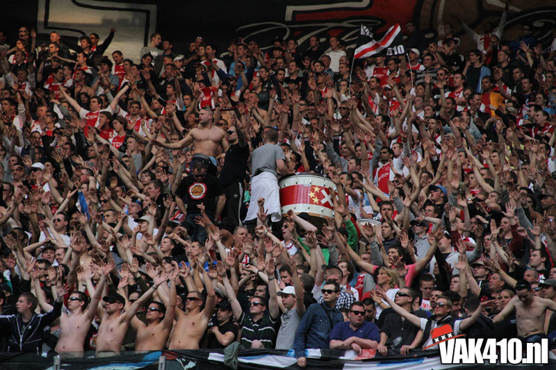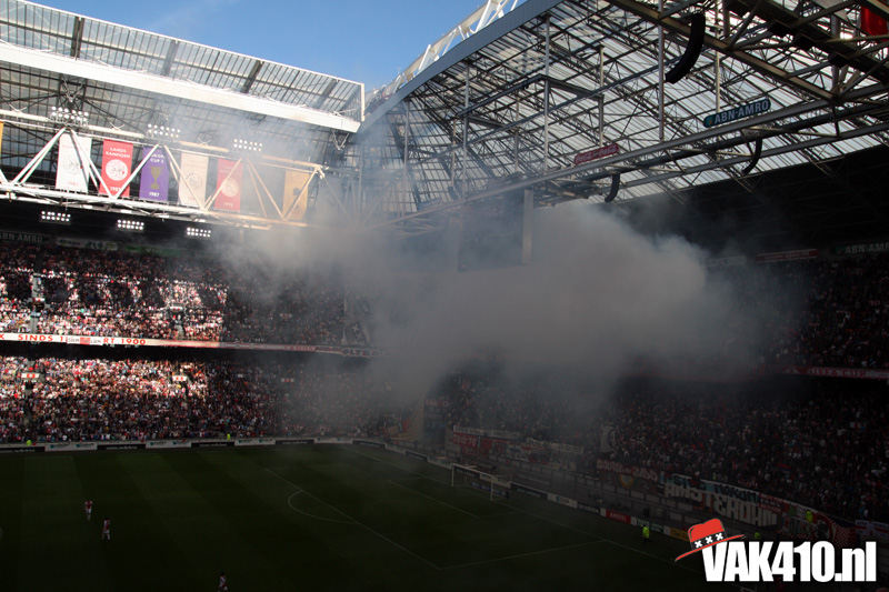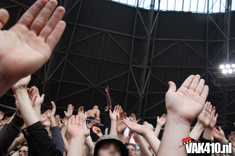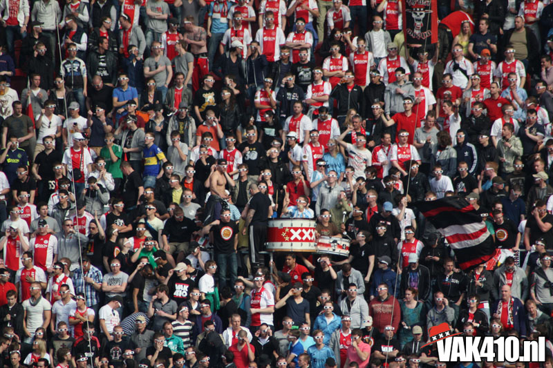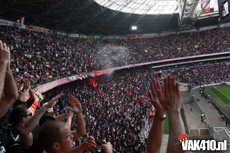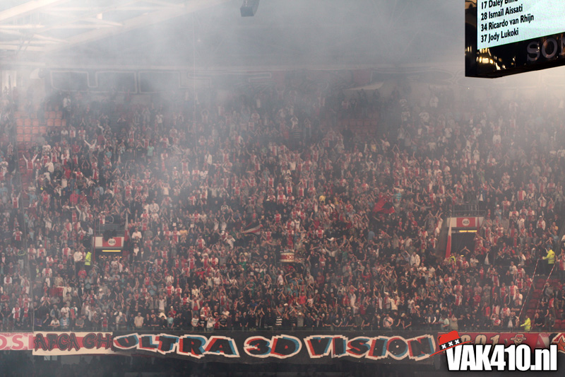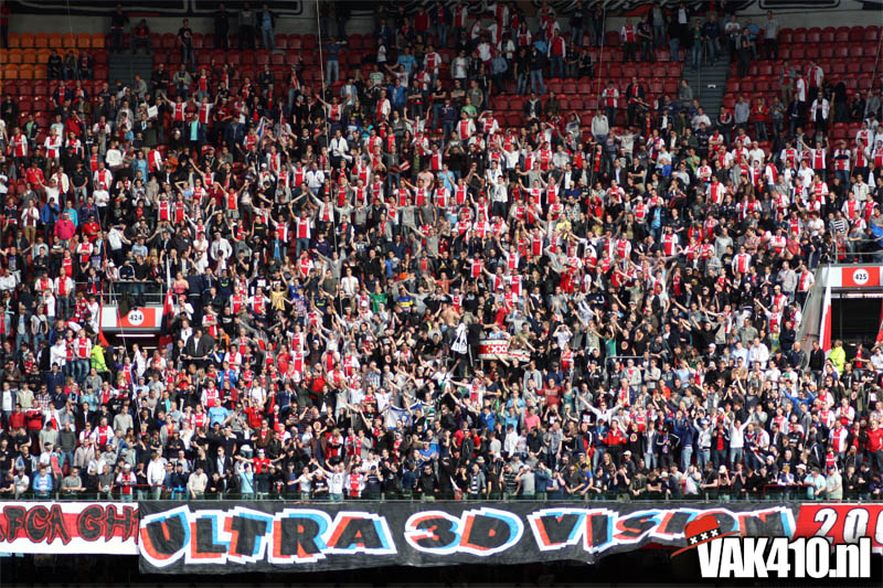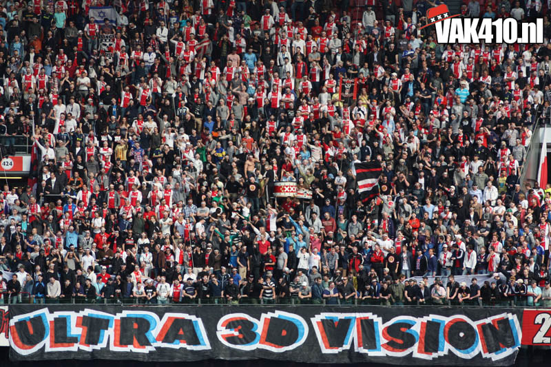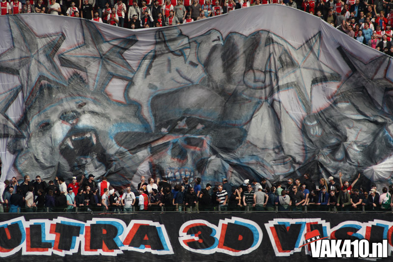 Op 410 stond vandaag een wereld primeur op het menu: ULTRA 3D VISION. Voordat het doek werd gehesen werden op het vak honderden zwarte zonnebrillen ingeruild voor 3d brilletjes. De wereld waarin wij leven is nou eenmaal driedimensionaal. Op het doek kwamen de leeuw, Ajax en 410 tot leven. Nee, ze kwamen eruit.