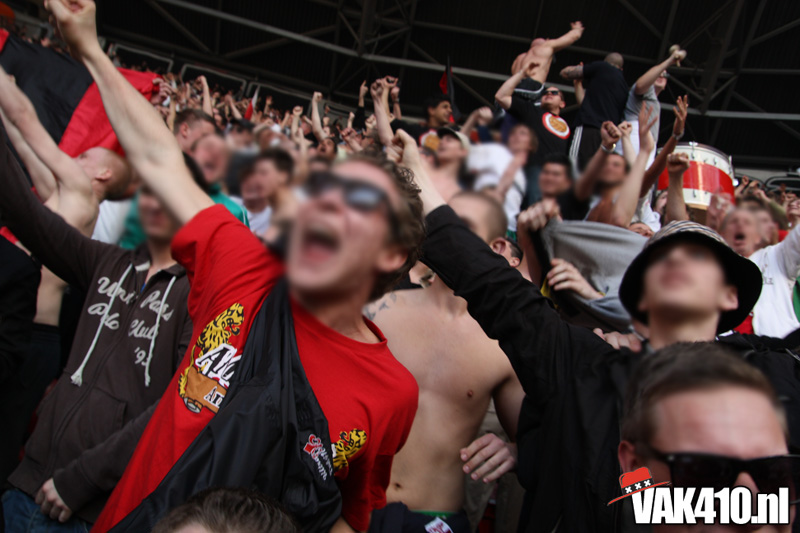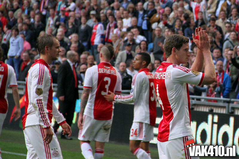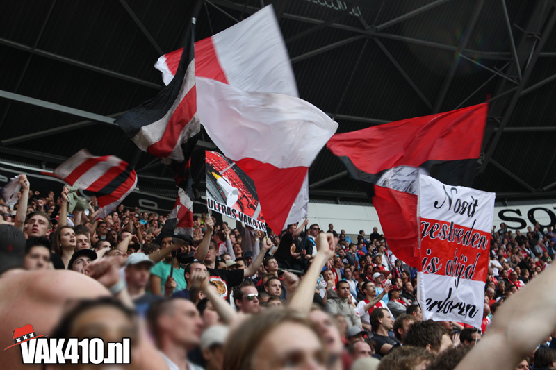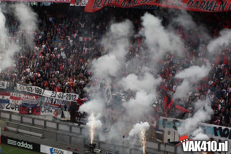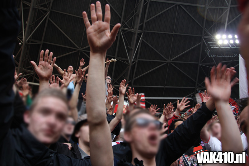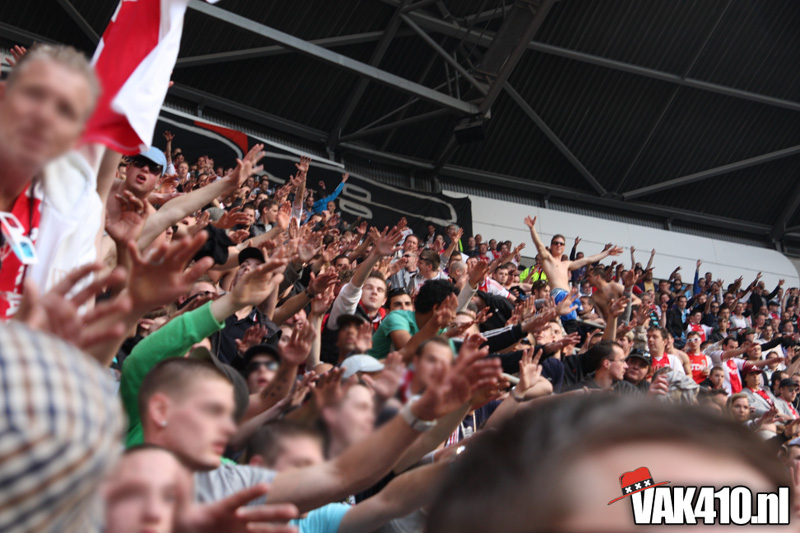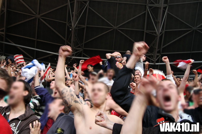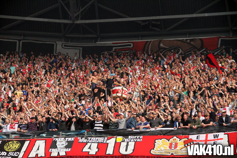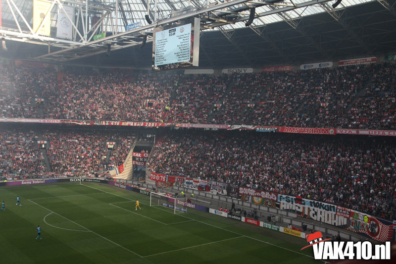 Op 410 stond vandaag een wereld primeur op het menu: ULTRA 3D VISION. Voordat het doek werd gehesen werden op het vak honderden zwarte zonnebrillen ingeruild voor 3d brilletjes. De wereld waarin wij leven is nou eenmaal driedimensionaal. Op het doek kwamen de leeuw, Ajax en 410 tot leven. Nee, ze kwamen eruit.