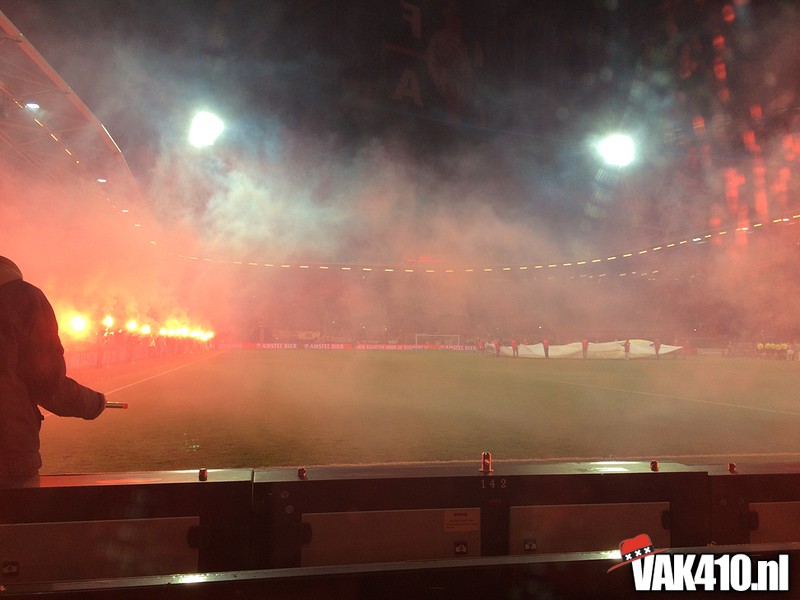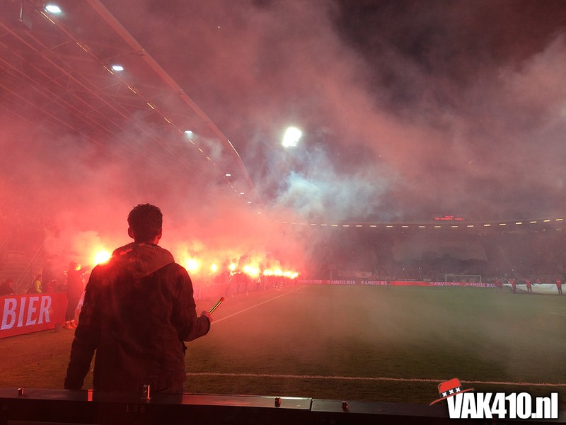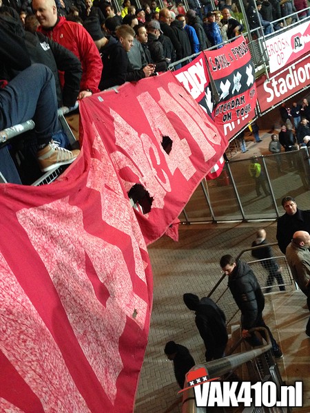 Het was een spannende voetbalavond, 2 rode kaarten, een gestopte penalty, een uitblinkende Vermeer en een schitterende vrije trap die ons de doortocht naar de Kuip bezorgde. Het uitvak overstemde 90 minuten lang de klappers van AZ. Na afloop van de wedstrijd werd de overwinning gevierd met de spelers zoals het hoort. De supporters op het hek en de shirts niet uitgewisseld met de tegenstanders, maar weggegeven aan de immer trouwe Ajacieden.