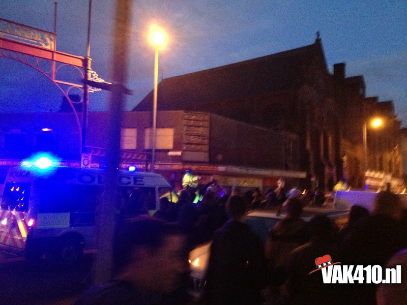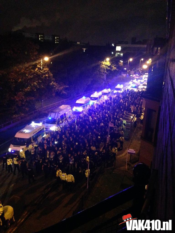 Op de wedstrijddag werd het centrum van Glasgow overgenomen door de vele Ajax supporters en in verschillende kroegen werd er verzameld. De als fanatiek bekend staande Celtic supporters waren niet tot nauwelijks te zien overdag. Later op de middag stegen de baromzetten verder en vormde zich een grote groep voor één van de kroegen. In deze formatie werd er te voet pas gezet richting Celtic Park. Alle toeters en bellen gingen direct af bij de Schotse smeris en na een kat en muis spel werd na ongeveer een half uur de groep ingesloten en onder zware politie begeleiding richting het stadion geëscorteerd. Tot onze verbazing bleek er vooraan deze escorte een grote afvaardiging van de Amsterdamse voetbaleenheid aanwezig. Waar in Amsterdam de zakkenrollerij hoogtij viert en de crisis van dal naar dal gaat worden deze heren keer op keer doodleuk op een snoepreisje gestuurd. In een slakkentempo kwamen we een klein half uur voor de wedstrijd dan eindelijk aan op het beruchte Celtic Park. De verhalen die over dit stadion de rondte gaan zijn mythisch en ontzagwekkend te noemen. Gelukkig hebben we voor hetere vuren gestaan en is dit eiland toch vrijwel standaard een tegenvaller.