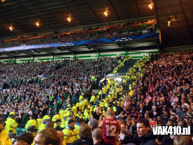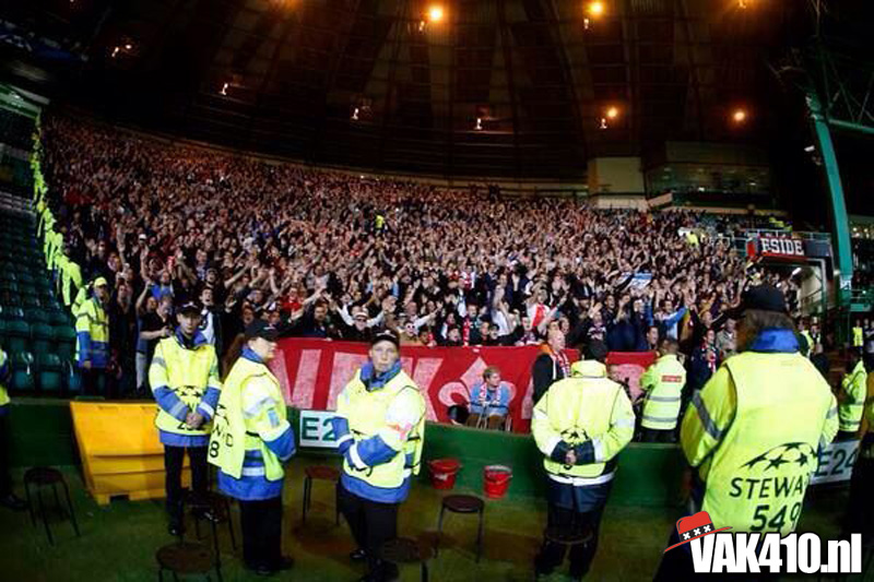 Voor de bekende Champions League hymne klonk het You'll Never Walk Alone. Werkelijk iedereen hield een sjaaltje omhoog en zong mee. Tijdens de wedstrijd was er ook een massale pogo te zien, dit was bijna te gek om waar te zijn, het hele stadion draaide de rug richting het veld. Dit was overigens als reactie op het uitvak wat knalde, vele malen werd het thuispubliek overstemd, zeker de gehele eerste helft. Vlak voor rust viel de 1-0 uit een penalty en werden de Schotse provocaties beantwoord met een regen van stoelen, munten en aanstekers. Waar de 1-1 had moeten vallen, viel na de rust de 2-0 en dan weet je dat het een heel lastig verhaal wordt. Desondanks kende het uitvak ook bij de achterstand een aantal goede piekmomenten. In de blessuretijd viel de aansluitingstreffer nog, maar dat mocht niet meer baten. Wel goed om van de Schotten zelf te horen dat er nog nooit zo'n hard uitvak is geweest op Celtic Park, een compliment om trots op te zijn. Amsterdam on top!