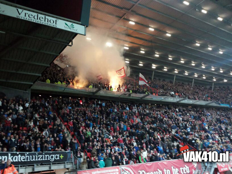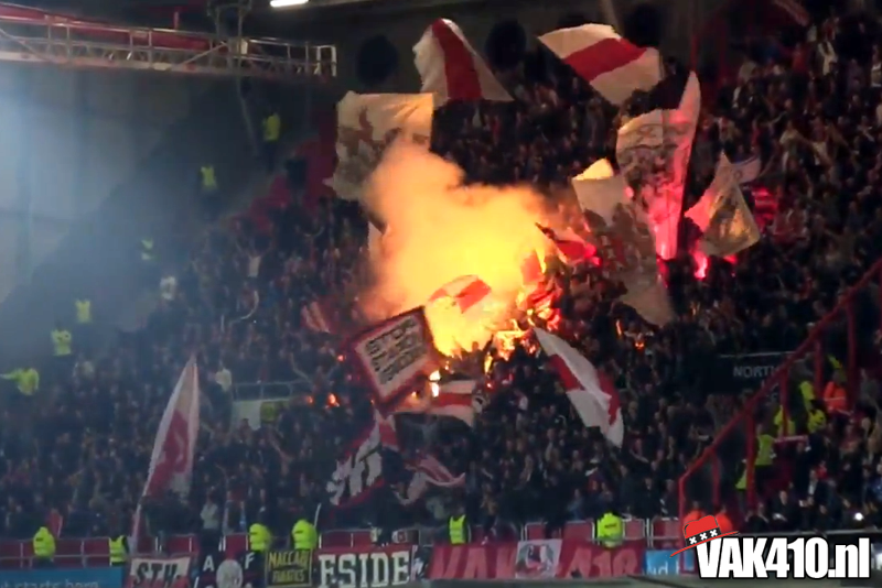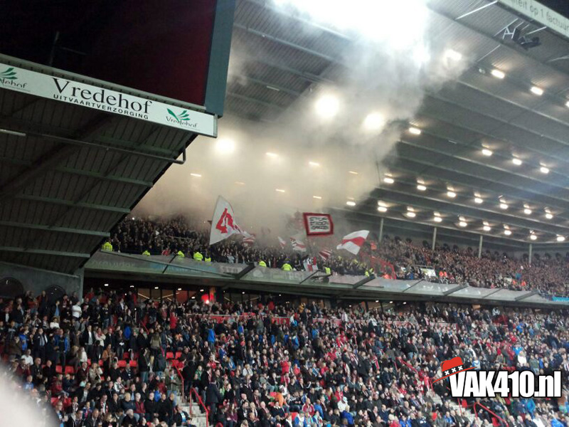 Bij opkomst van de spelers toonde VAK P een choreo van een niveau dat we niet gewend van ze zijn. Later bleek deze ook mislukt te zijn. Het uitvak eiste dan ook verreweg de meeste aandacht op. Verspreid over het vak vele vlaggen en een groot aantal mega vlaggen. Tegelijk werd er een pyro show van formaat weggegeven en de toon was meteen gezet. Helaas had dit weinig invloed op de 11 op het veld, want de 1e helft was om te janken.
