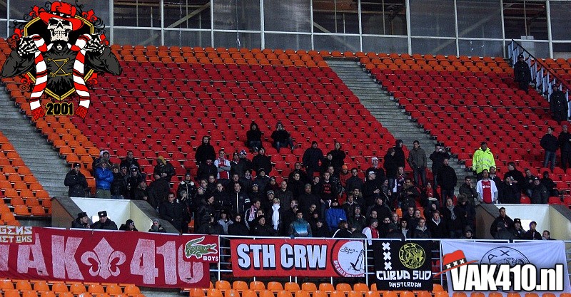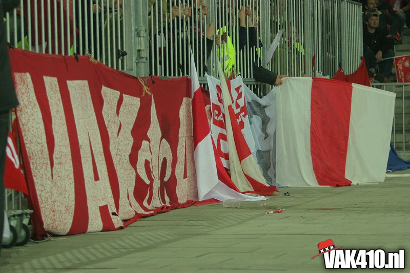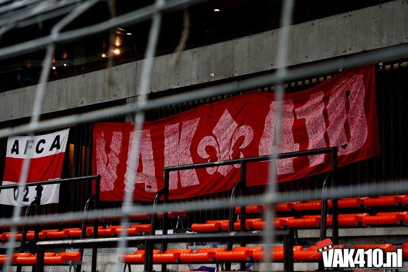 Vanaf nu heeft VAK410 dus een nieuw groepsdoek, de opvolger van het origineel maar exact hetzelfde. En om goed te beginnen zijn we met een groot deel van de groep met het nieuwe doek op de foto gegaan, voorafgaand aan de wedstrijd Ajax – Twente. Vanaf Vitesse uit zal het nieuwe groepsdoek dan ook overal met ons meereizen.