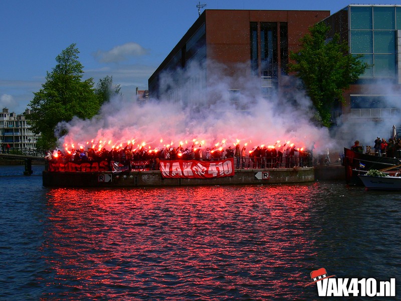 Op 29 mei 2003 was het huidige groepsdoek voor het eerst te zien op VAK410. Destijds nog niet het groepsdoek maar vanaf dat moment gewoon één van de vaste spandoeken op het vak. Vanaf het seizoen 2004-2005 werd het huidige doek het vaste gezicht met uitwedstrijden. Van Groningen tot Kerkrade, van Enschede tot aan Rotterdam. Maar natuurlijk ook in Europees verband bijvoorbeeld in Moskou, Tel Aviv, Kopenhagen, Manchester, Auxerre en Turijn. Door weer en wind, in voor- en tegenspoed. Altijd met ons mee, maar vanaf nu met pensioen.