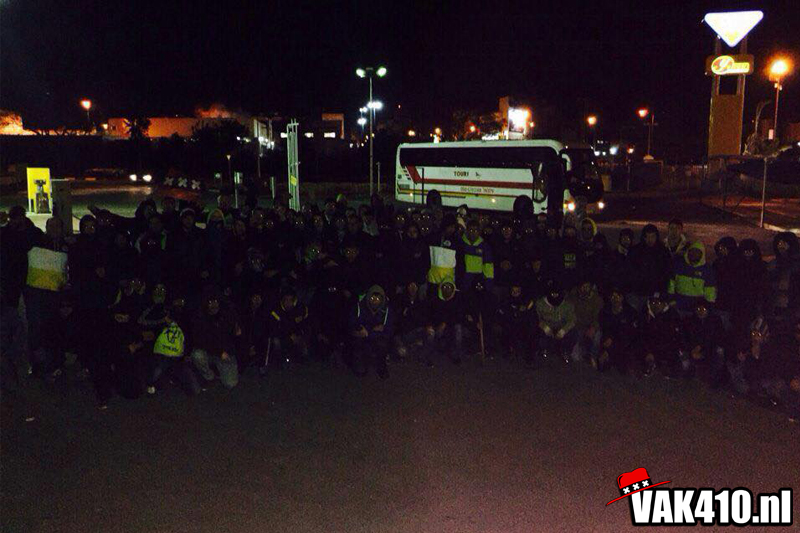 We verzamelen met ruim 60 man bij een tankstation vlakbij het stadion, aan dit tankstation grenst een soort van terras waar iedereen zijn nodige versnaperingen neemt. Hier blijft het rustig en er is bovendien opvallend weinig politie. We besluiten richting het stadion te lopen met een groep van ongeveer 60 man. Aangekomen bij het stadion en het uitvak besluiten we even te wachten. Enkele minuten later krijgen we plots bezoek van een man of 70 zeker van Haifa en hun vriendjes van Beer Sheva Ultra south. Ze vallen direct aan en beginnen met veel flessen en stenen te gooien, de riemen gaan los en hier en daar gaat het er hard aan toe over en weer. Haifa gaat achteruit om vervolgens eieren voor hun geld te kiezen en weg te rennen naar hun eigen kant. Het bizarre is dat als wij om ons heen kijken, we alleen wat paarden zien, even later komt er wat meer politie een kijkje nemen, maar voor een wedstrijd van dit affiche is het bijzonder weinig. Er worden hier en daar arrestaties verricht. Een jongen van MF o.a maar deze is voor de wedstrijd al weer vrij en kan gewoon plaatsnemen in het uitvak.