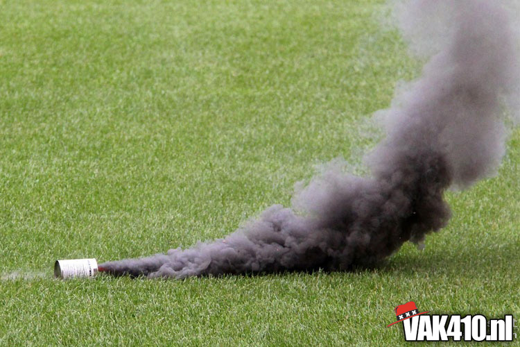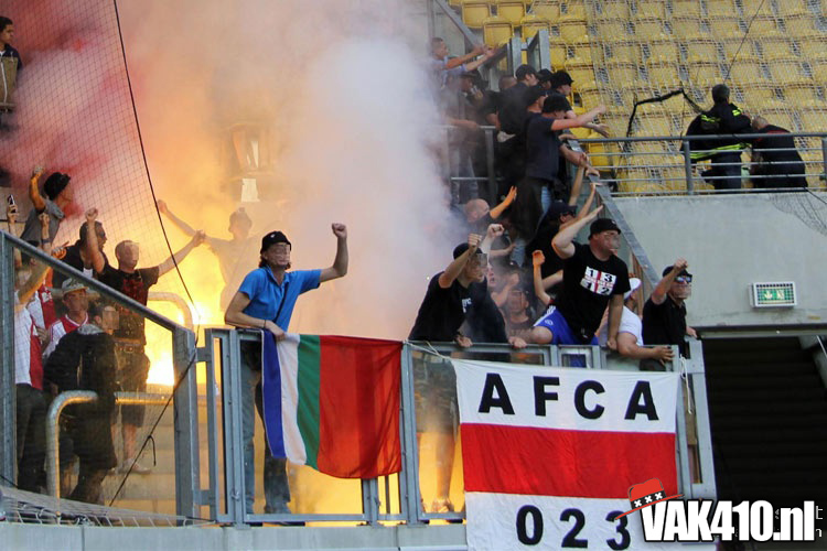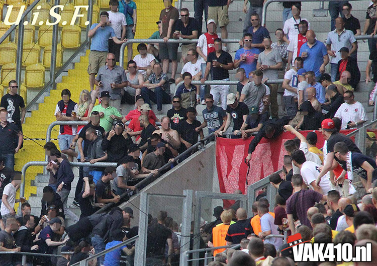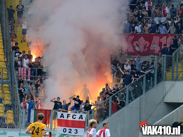 In de 14e minuut was er een kleine wit-rood-witte rookshow. Met veel gefluit van de thuisaanhang op deze actie en enkele rookpotten op het gras, was de toon gezet. Wij allen kennen ook de vocale steun van Dynamo. Op enkele hele harde momenten van DY-NA-MO en massale handclaps na was de sfeer niet zo goed. Voor en tijdens de match werden enkele Ajacieden uit de groep gehaald. Op het vak werd de bestorming van de politie die enkele van ons er uit pakte, niet gewaardeerd door ons. Na de 0-3 en het incident met het oppakken van onze jongens werden we nog een uur vastgehouden bij onze bussen. Enkele stenen werden over een heg gegooid waarop enkele arrestaties volgde. telefonisch werd er gemeld dat wij 5 minuten nadat we met de bussen zouden vetrekken nog wat konden verwachten. We wachten nu nog in spanning af op het grote Dynamo?! Wellicht was voor vele van hun de zomerstop belangrijker dan dat een grote club als Ajax op bezoek komt.