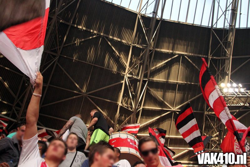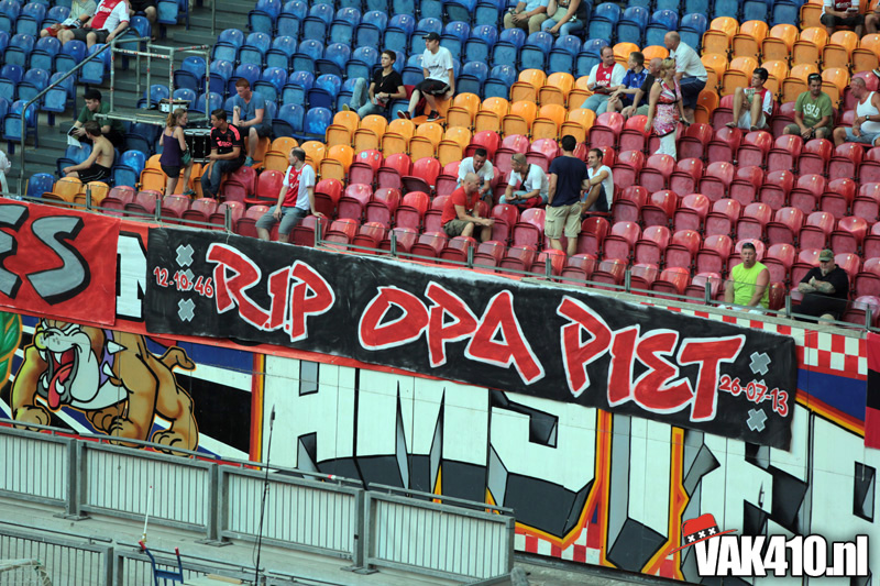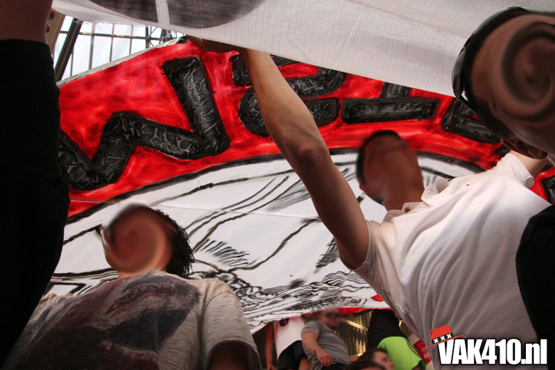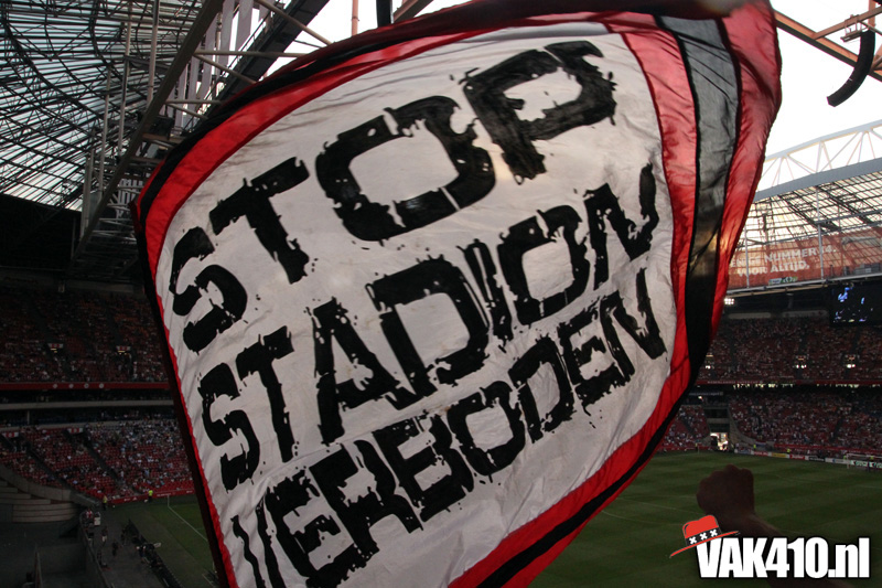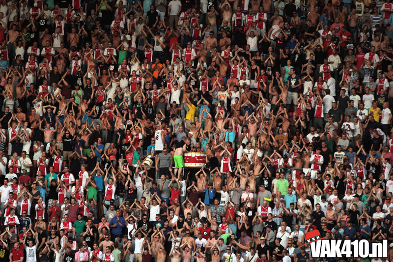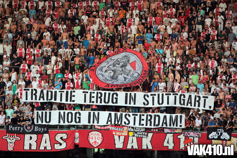 De competitie is weer begonnen, Ajax zet vol in op het record van 4 titels op rij! Dit maal hopelijk resulterend in een huldiging op de plek waar het hoort; de Amsterdamse binnenstad. Ondanks het feit dat de wedstrijd op een vrijdag plaatsvindt staat het grasveldje bij het honk al vroeg vol. Onder het genot van een lekker zonnetje gaan de koude en lauwe biertjes er goed in. Even bijkletsen, zo goed als iedereen is er weer. Over voetbal praten heeft verder weinig zin, zelfs na 5 wedstrijden spelen is het nog steeds mogelijk dat Ajax ineens zijn topspelers verliest. Transferperikelen, het heeft geen zin om je er druk over te maken! De enige dag roept een speler "ik blijf" en de volgende dag komt er "een mooie club met een uitdaging die ik niet kon laten schieten" Wij zullen echter altijd blijven gaan naar onze liefde, ultras everyday! In het stadion worden de supporters van Stuttgart gefeliciteerd met hun overwinning. Na een jarenlange strijd heeft de club eindelijk haar oude logo terug. Traditie is terug in Stuttgart, nu nog in Amsterdam! Ajax wint de wedstrijd overigens zonder bijzonder goed te voetballen vrij eenvoudig met 3-0.