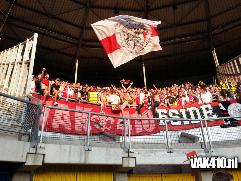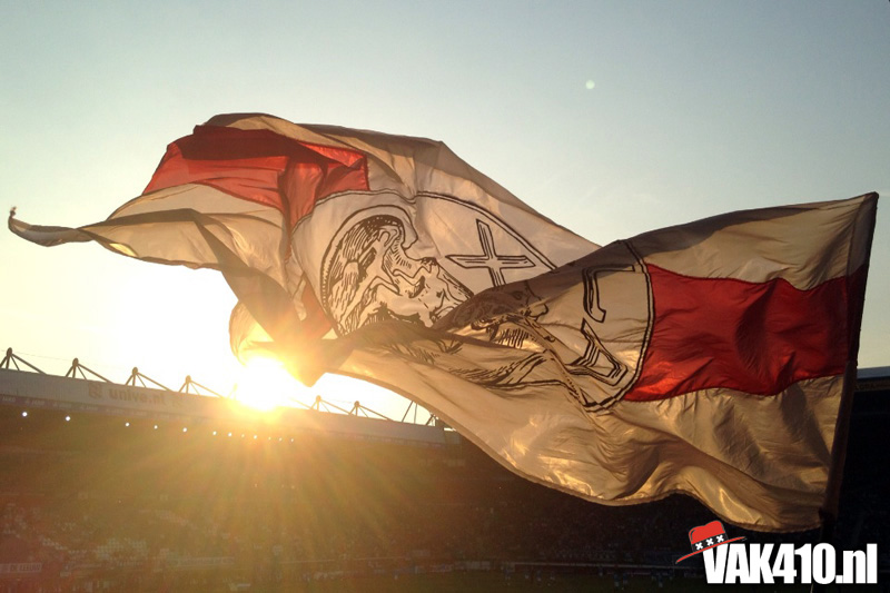 Twee seizoenen terug werd er in het uitvak een grote hoeveelheid vuurwerk ontstoken. Vonden wij geweldig, bij Heerenveen waren ze er iets minder over te spreken. Vorig seizoen mochten supporters daarom geen sfeerattributen meenemen. Wij hebben er destijds voor gekozen om een oproep te doen om iedereen in het wit-rood-wit te hijsen. Zag er prachtig uit, dus daarom deze keer maar weer, en dat is geen straf met het heerlijke weer. Dit jaar speelt Ajax in het zwart met roze. Dat mag modieus en modern zijn, het heeft geen connectie met onze club en stad, een reden temeer het uitvak wit-rood-wit te kleuren.