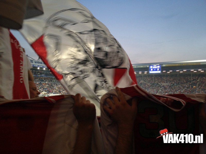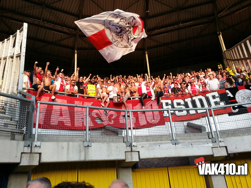 Onze bus komt als eerste aan bij het stadion van de blauw-witten. Bij aankomst blijkt maar weer eens hoe onnodig moeilijk het supporters iedere keer weer gemaakt word. In het voor overleg is er aan Ajax aangegeven dat het is toegestaan om 50bandieri’s mee te nemen, één drum, en geen GROTE spandoeken. Een groot spandoek, tja wat moet je daar anders van maken dan zo één die we zo nu en dan over de tribune laten gaan…? Echter, bij Heerenveen noemen ze het VAK410 uitdoek een groot spandoek, deze mag niet mee naar binnen. Een gesprek over de velen portofoons en oortjes volgt, duurt lang en duurt maar. Dan komt ook de F-side binnen, zij mogen zich bij ons voegen en ook de gesprekken afwachten. Wanneer ons doek niet naar binnen mag, gaan wij ook niet naar binnen, onze identiteit pak je niet van ons af! Eindelijk positief bericht volgens een medewerker van Heerenveen, die ene mag mee naar binnen, maar die ander niet! Een keuze die beide groepen uiteraard niet kunnen accepteren! Na lang onderhandelen en veel onnodig geouwehoer, kunnen we eindelijk allemaal een plekje zoeken in het uitvak en de groepsdoeken ophangen.