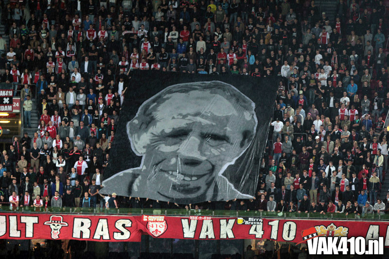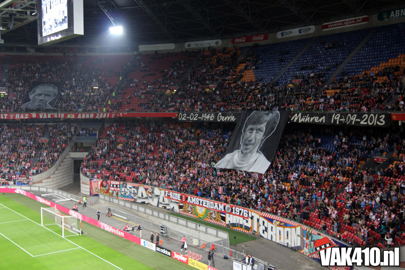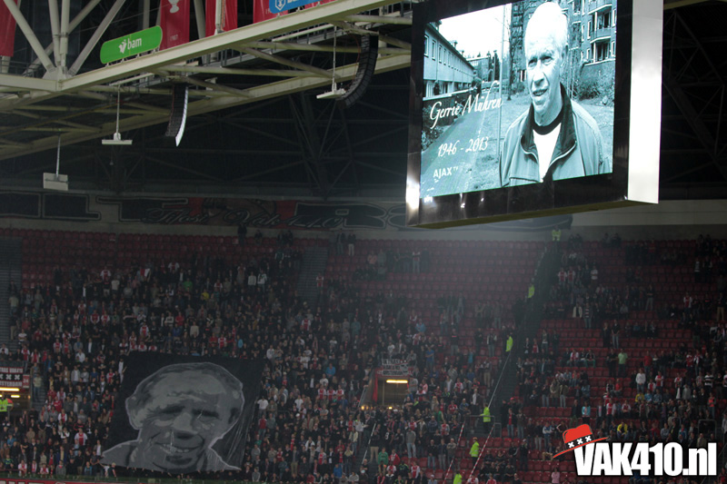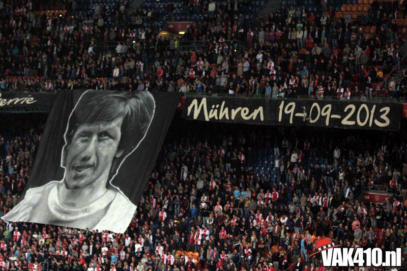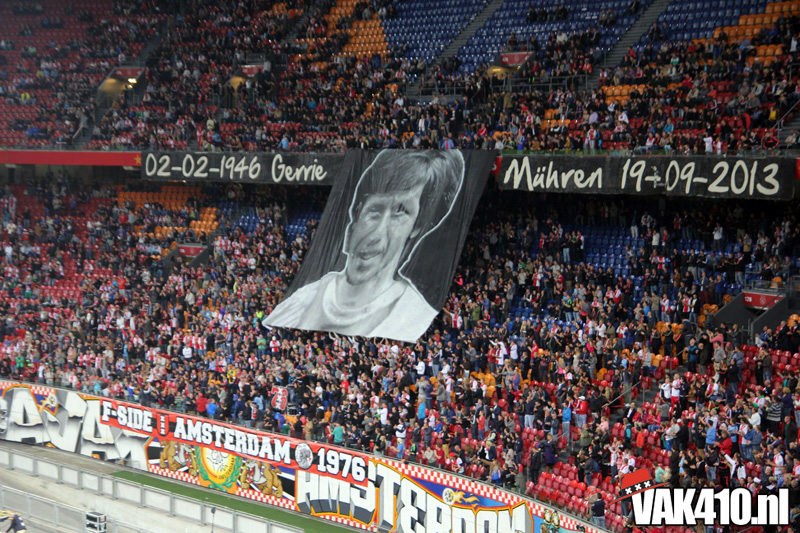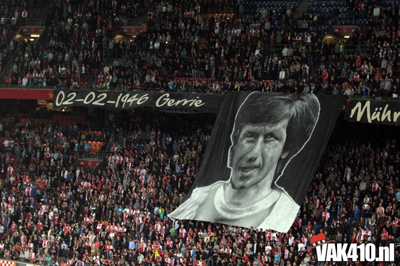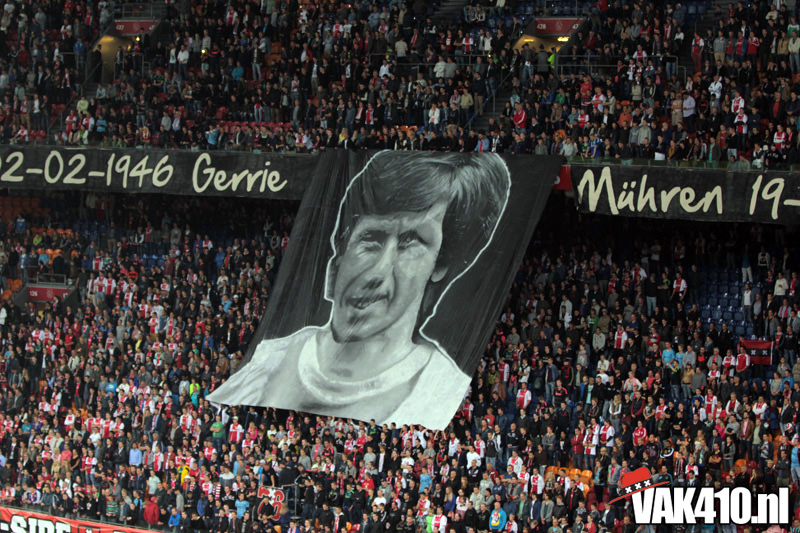 Vorige week donderdag overleed Gerrie Mühren op 67jarige leeftijd. Ajax speelde gister de bekerwedstrijd tegen zijn eveneens oude club, Fc Volendam. Namens Ajax en de supporters word er op indrukwekkende wijze afscheid genomen, met een minuut stilte en twee spandoeken voor Gerrie.