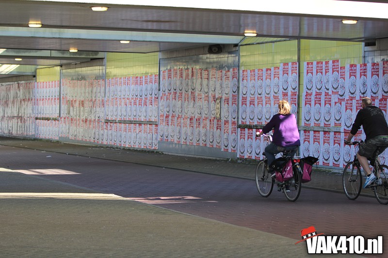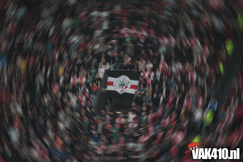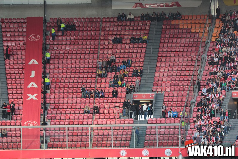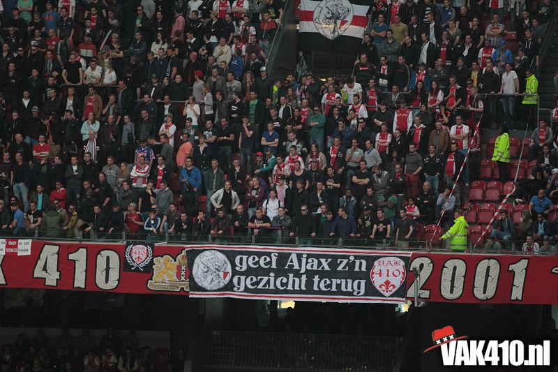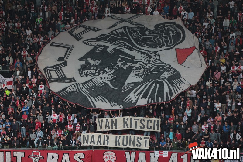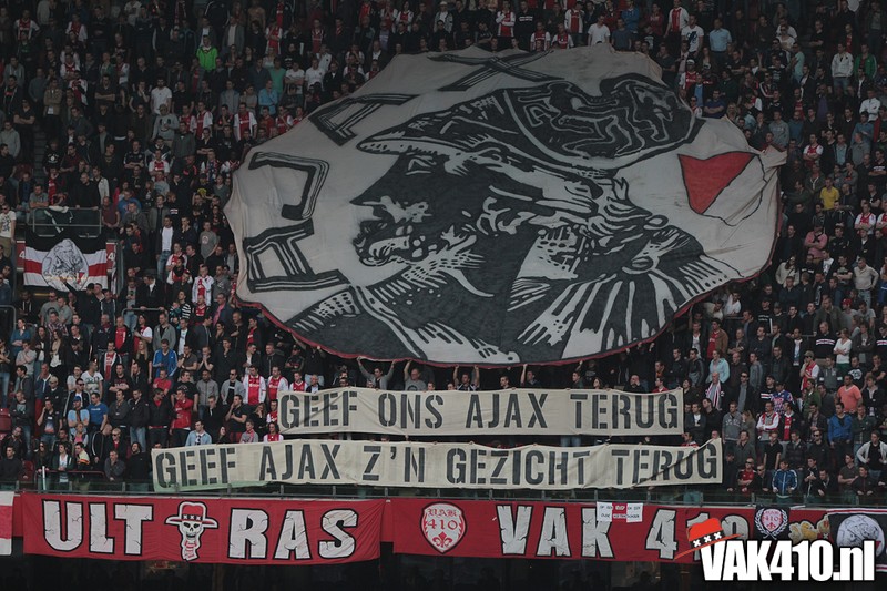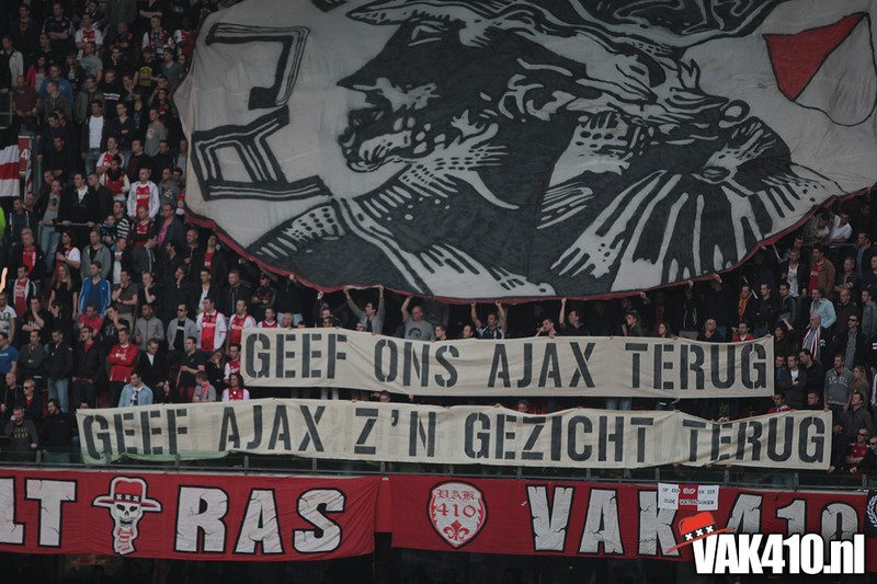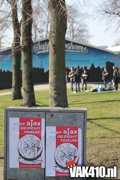Bij de ingangen van het stadion werd er, vandaag wel succesvol, geflyerd voor de actie Geef Ajax zijn gezicht terug. Eenmaal in het stadion bleek al gauw dat nagenoeg alle Cambuur supporters de toegang was geweigerd, zonde! Ook vandaag stond het oude logo weer centraal op het vak, ditmaal door middel van een megadoek met begeleidende tekstdoeken die meerdere malen gedurende de wedstrijd werden getoond. Ajax speelde uiteindelijk teleurstellend gelijk, waaruit maar weer bleek dat de titel nog zeker niet binnen is. Aankomende zondag staat NAC uit op het programma, een lastige horde op weg naar titel nummer 33.